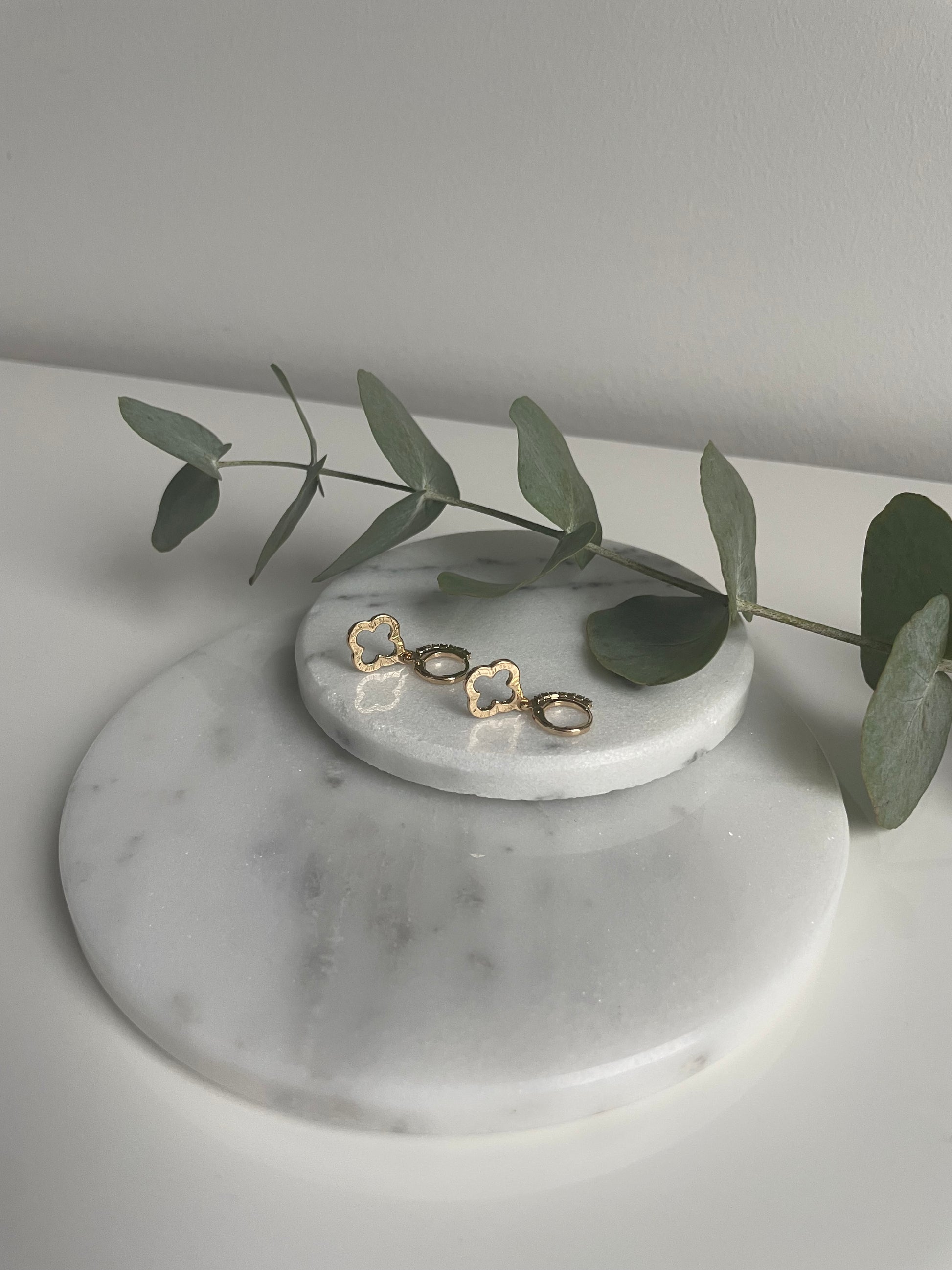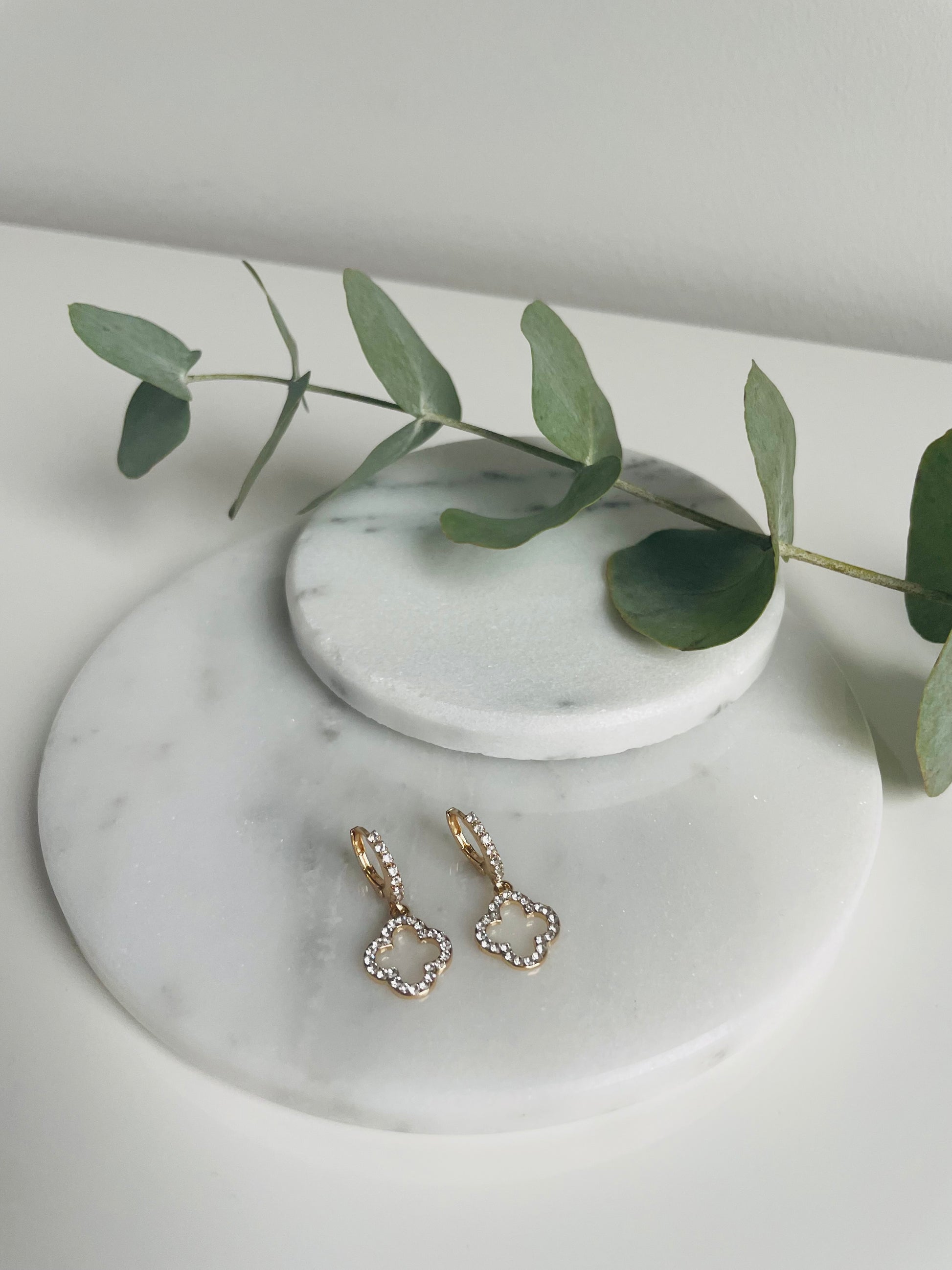 Die Shamrock Ohrringe bestehen aus einem goldenen Kleeblatt mit Steinen.